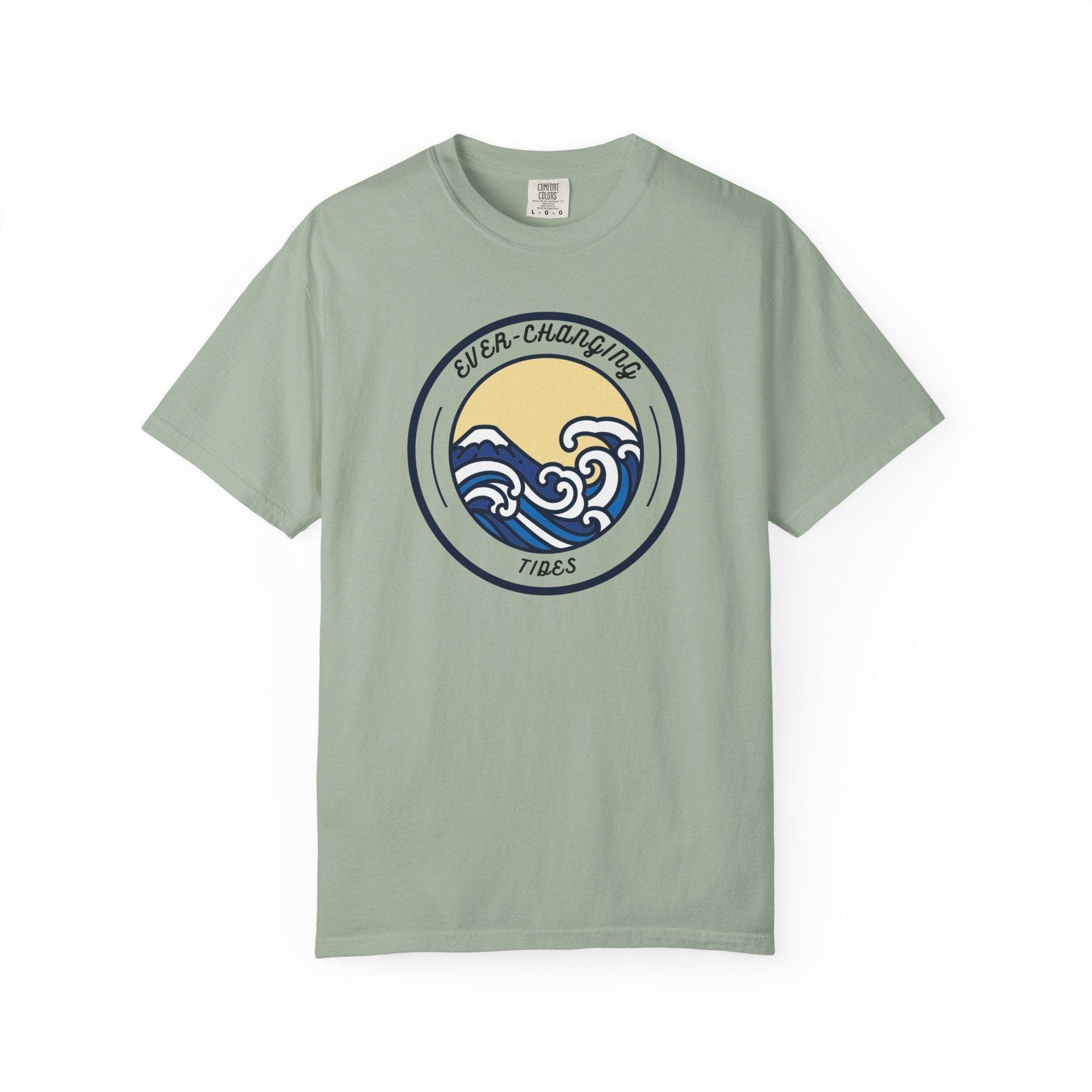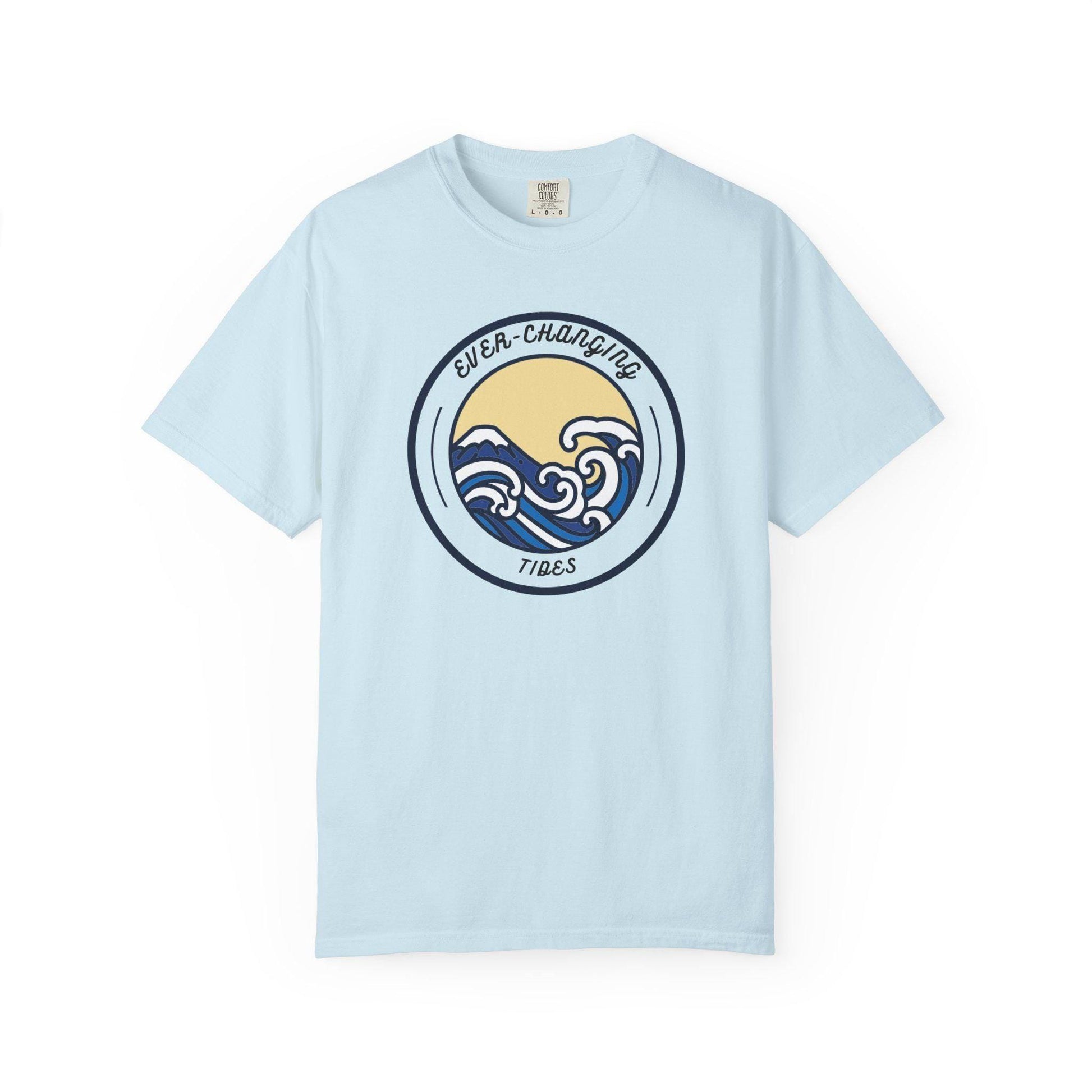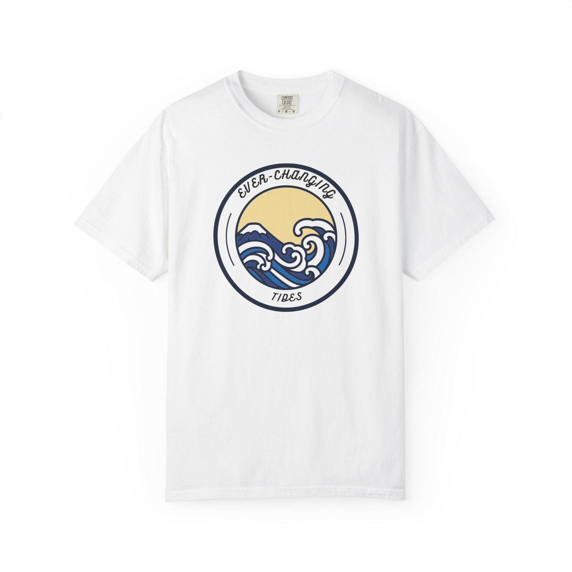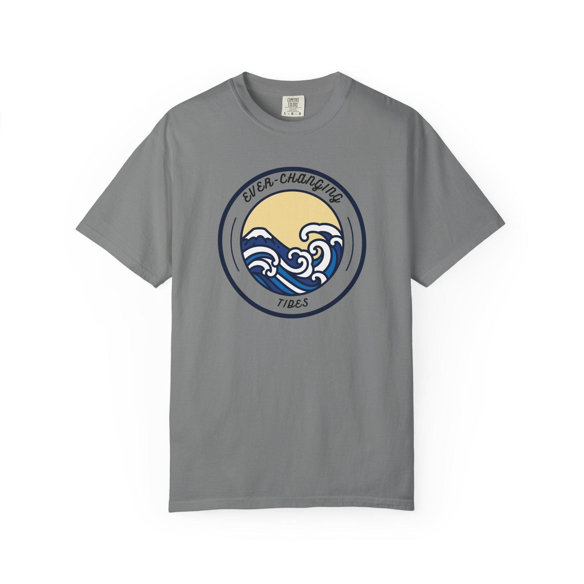 Soft, heavyweight cotton with a worn-in, garment-dyed finish—this relaxed tee feels like a trusted companion from the first wear. A simple, coastal-inspired crest sits on the chest: a sun sinking behind stylized waves with the handwritten phrase “Ever-Changing Tides.” It reads like a quiet reminder to breathe through change and carry calm into busy days. Throw it on after surf, over a tee for a bonfire, or tuck it into high-waisted jeans for slow Saturday mornings. The roomy cut and dense fabric give it structure without stiffness, while the tubular knit and sewn-in label keep the silhouette clean and fuss-free.