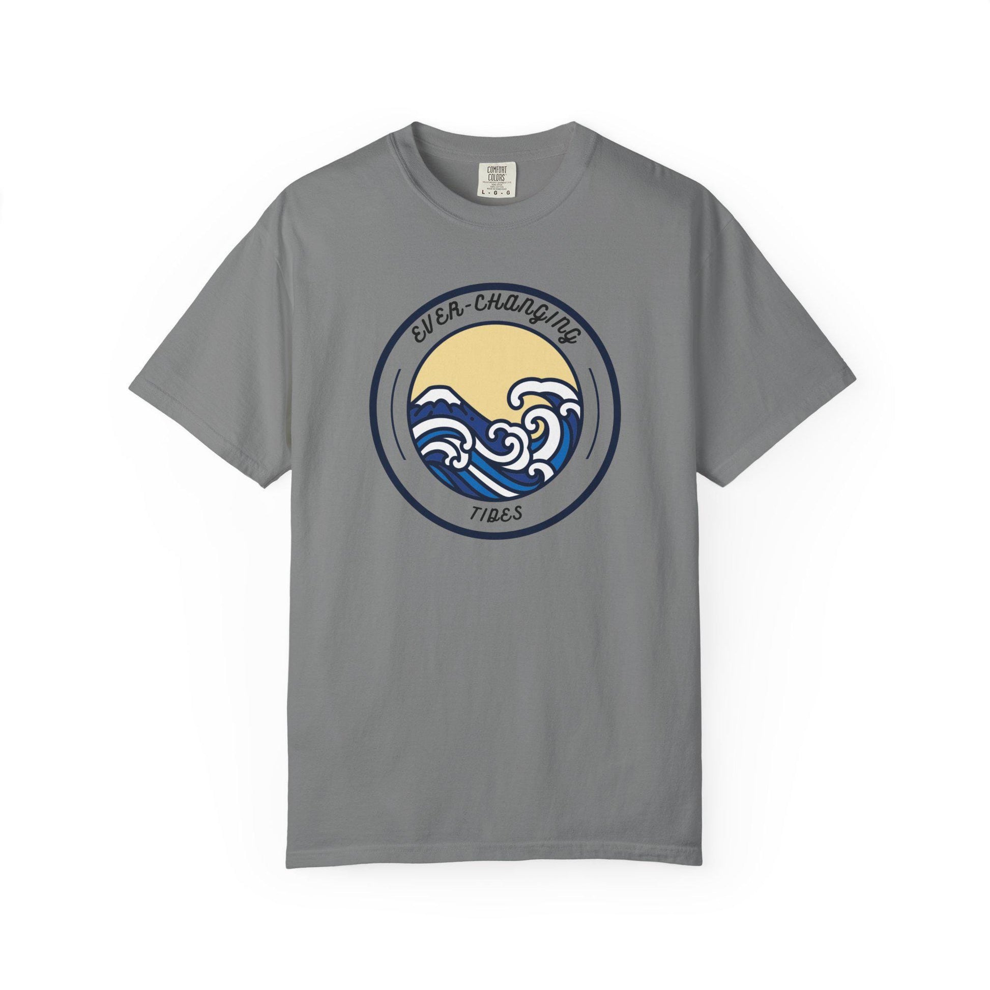 Soft, heavyweight cotton with a worn-in, garment-dyed finish—this relaxed tee feels like a trusted companion from the first wear. A simple, coastal-inspired crest sits on the chest: a sun sinking behind stylized waves with the handwritten phrase “Ever-Changing Tides.” It reads like a quiet reminder to breathe through change and carry calm into busy days. Throw it on after surf, over a tee for a bonfire, or tuck it into high-waisted jeans for slow Saturday mornings. The roomy cut and dense fabric give it structure without stiffness, while the tubular knit and sewn-in label keep the silhouette clean and fuss-free.