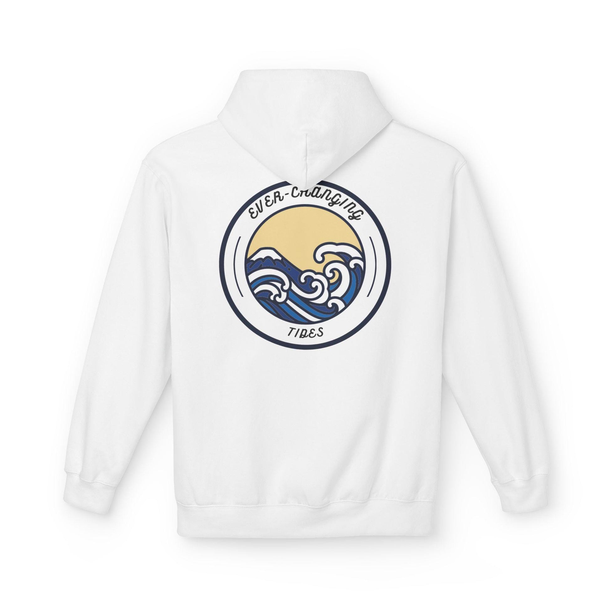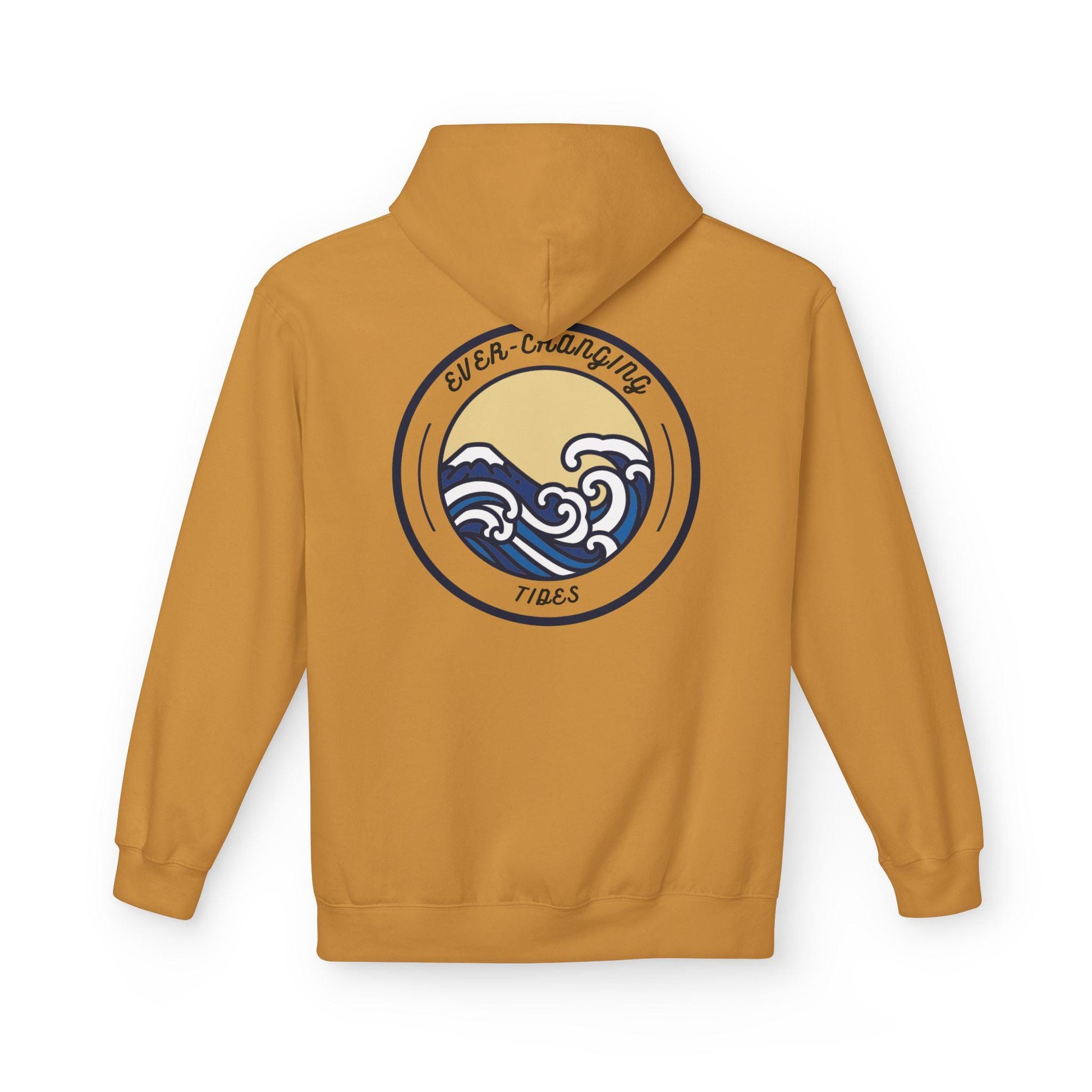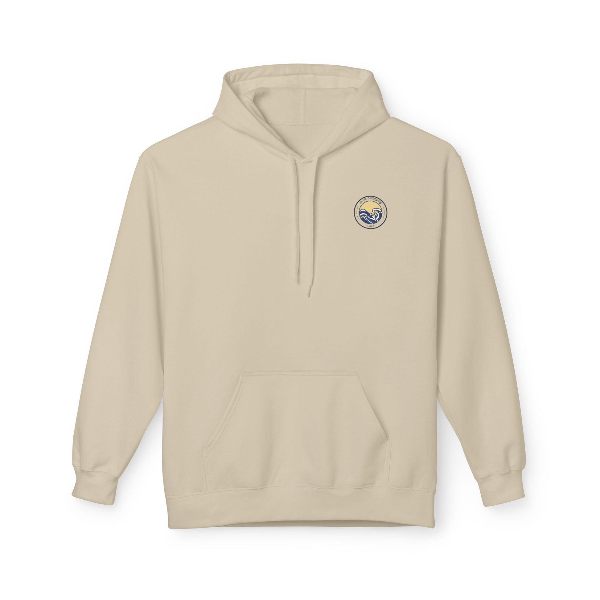 This midweight fleece hoodie carries a calm, coastal energy — soft enough for cool mornings and structured enough to layer through the day. A small crest sits at the chest while a larger, hand-drawn wave emblem rests on the back: warm sand tones meet navy breakers in a minimalist circle, with the phrase “even crashing tides” curved above. The two-piece lined hood and roomy pouch pocket make it easy to tuck hands or keep a scarf in place. The relaxed drop shoulder and classic fit create a lived-in silhouette that moves with you, whether you’re walking the shore, brewing coffee at dawn, or packing for a weekend away. Thoughtfully made in OEKO-TEX Standard 100 certified fabrics and produced in facilities with FLA and WRAP partnerships, it feels as responsible as it does comfortable.