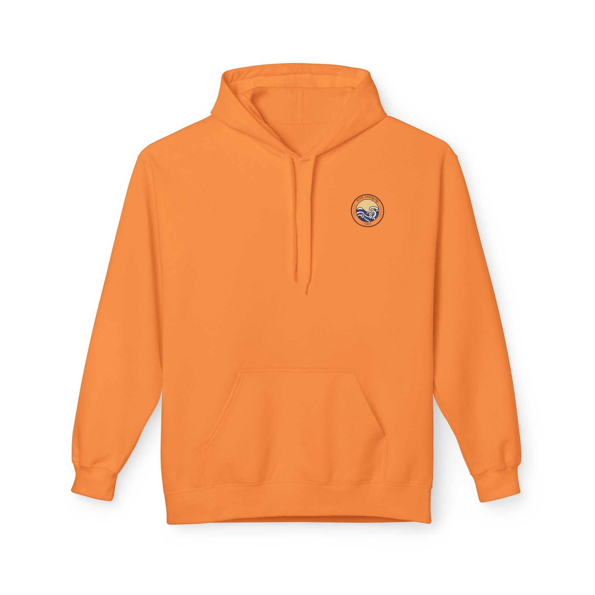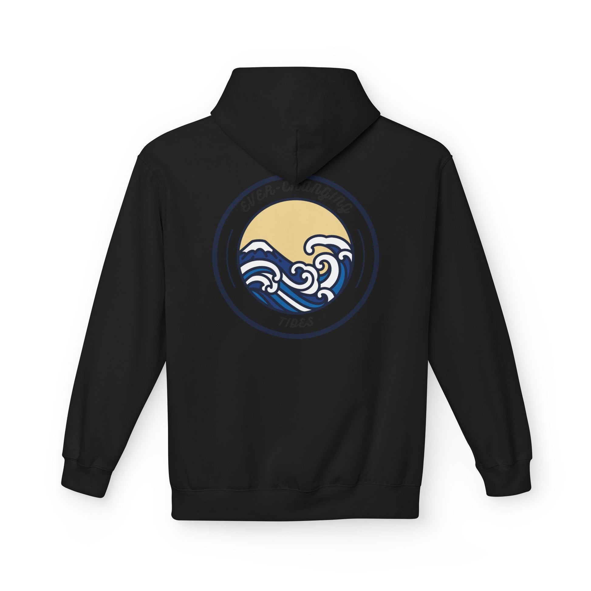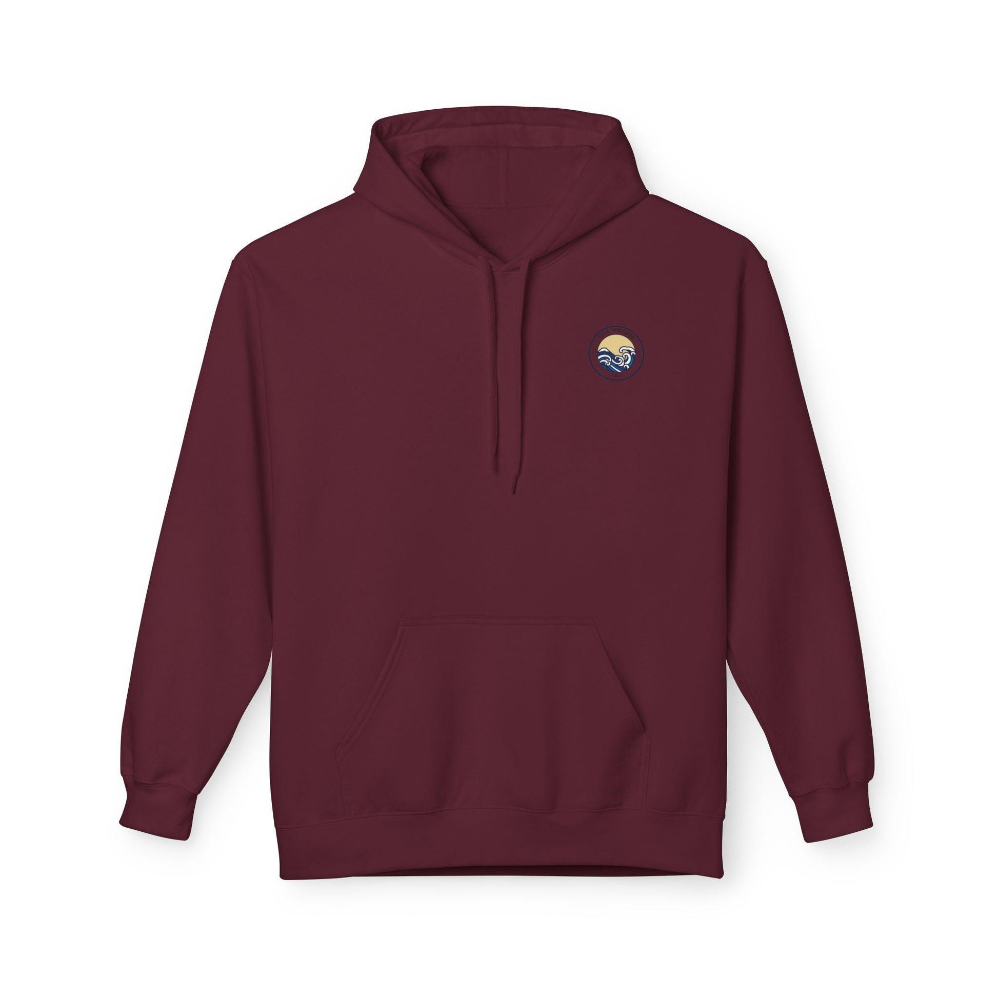 This midweight fleece hoodie carries a calm, coastal energy — soft enough for cool mornings and structured enough to layer through the day. A small crest sits at the chest while a larger, hand-drawn wave emblem rests on the back: warm sand tones meet navy breakers in a minimalist circle, with the phrase “even crashing tides” curved above. The two-piece lined hood and roomy pouch pocket make it easy to tuck hands or keep a scarf in place. The relaxed drop shoulder and classic fit create a lived-in silhouette that moves with you, whether you’re walking the shore, brewing coffee at dawn, or packing for a weekend away. Thoughtfully made in OEKO-TEX Standard 100 certified fabrics and produced in facilities with FLA and WRAP partnerships, it feels as responsible as it does comfortable.