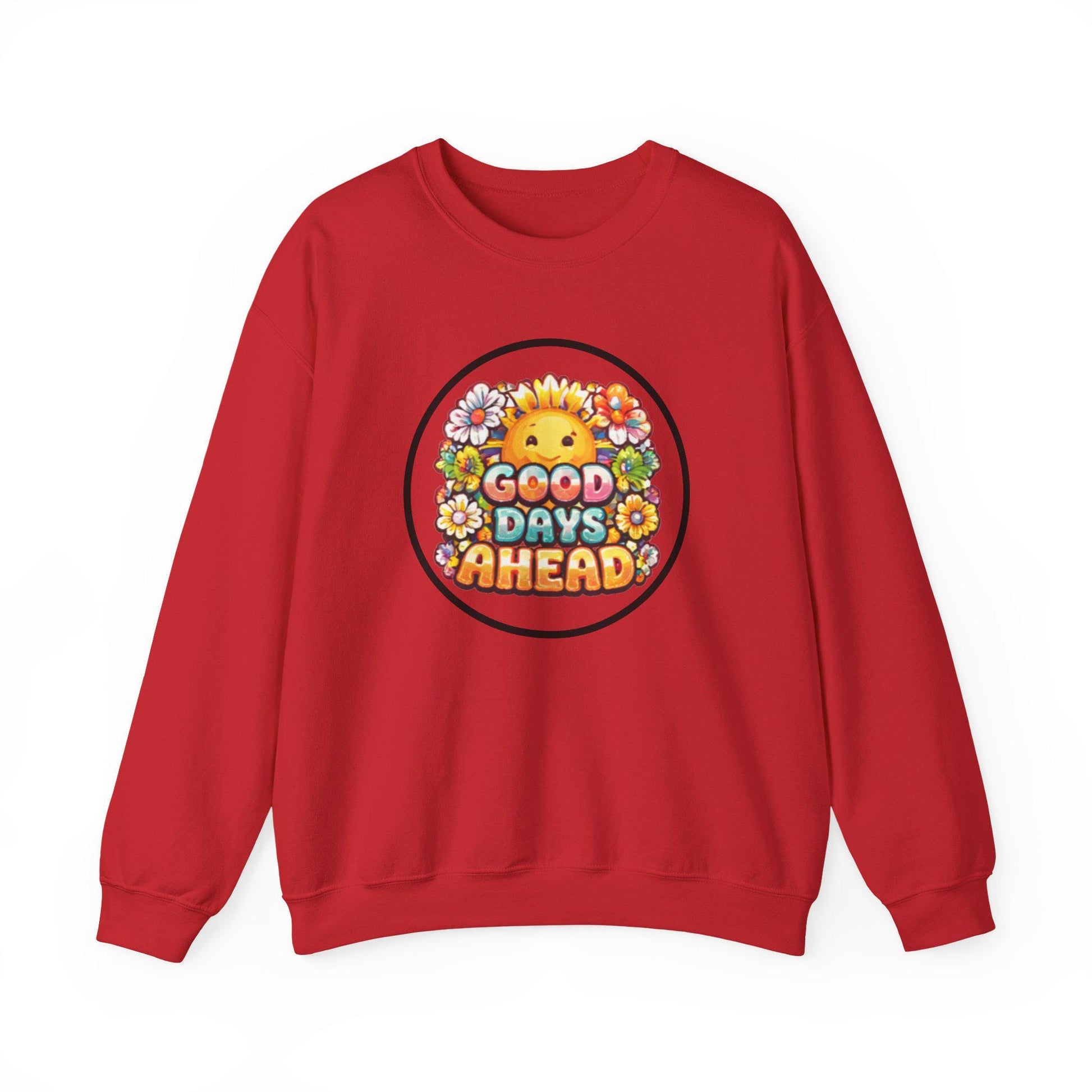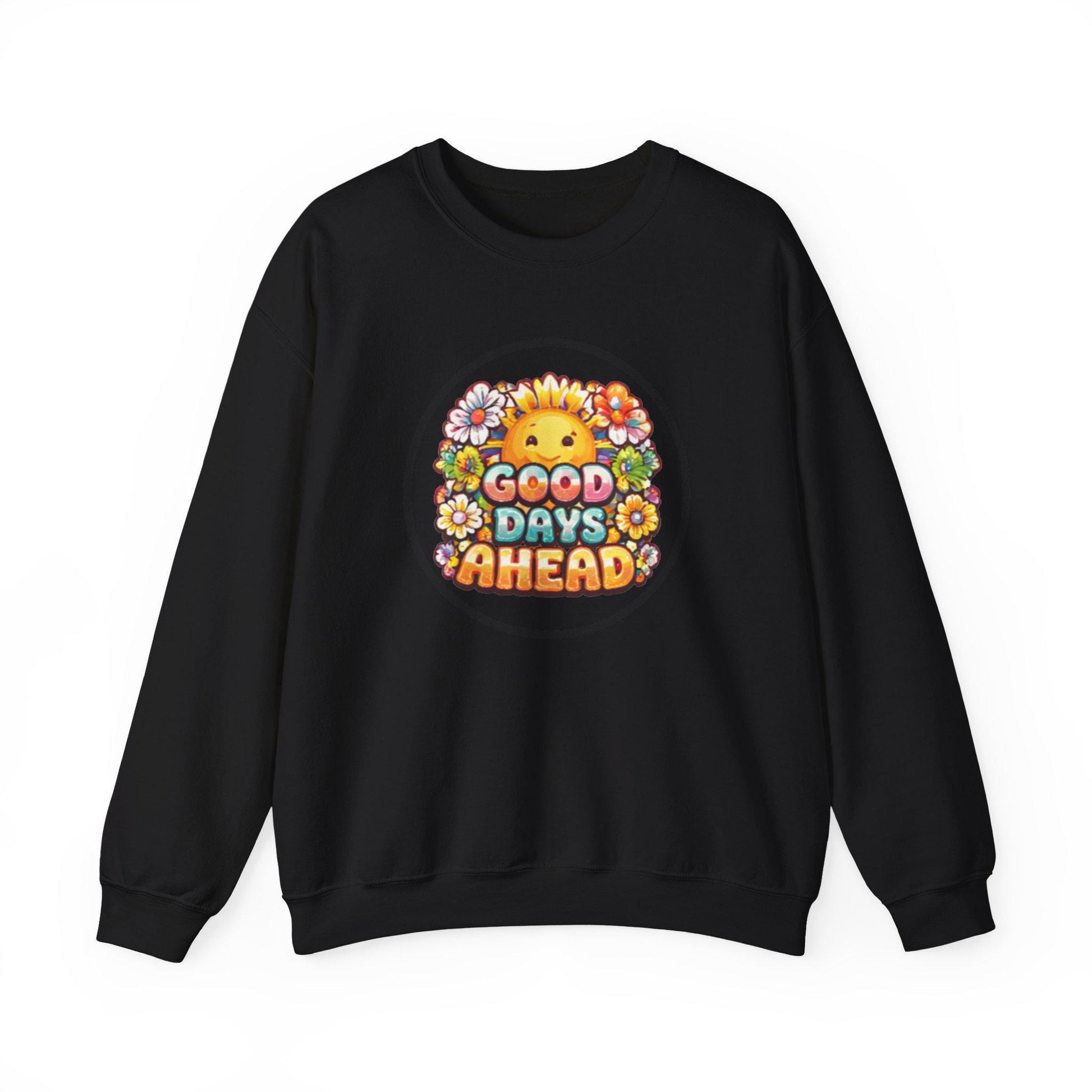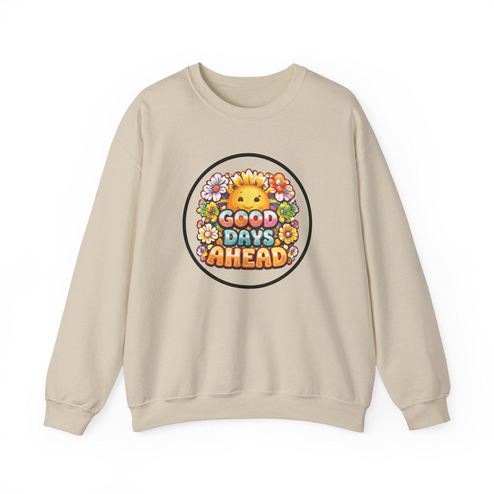 A cozy, midweight crewneck that carries a sunny, optimistic vibe. Soft 50/50 cotton-poly fabric and a classic fit make it an easy layer for slow mornings, walks in town, or coffee with friends. A cheerful illustrated sun and floral badge sits on the chest, announcing “Good Days Ahead” with warm color and playful lettering — a wearable reminder to lean into small joys. Thoughtful details like ribbed collar and cuffs, tear-away neck label, and reinforced double-needle stitching mean it feels reliable wash after wash. Wear it when you need a gentle lift: over a tee, paired with jeans, or layered under a jacket for chill evenings.
