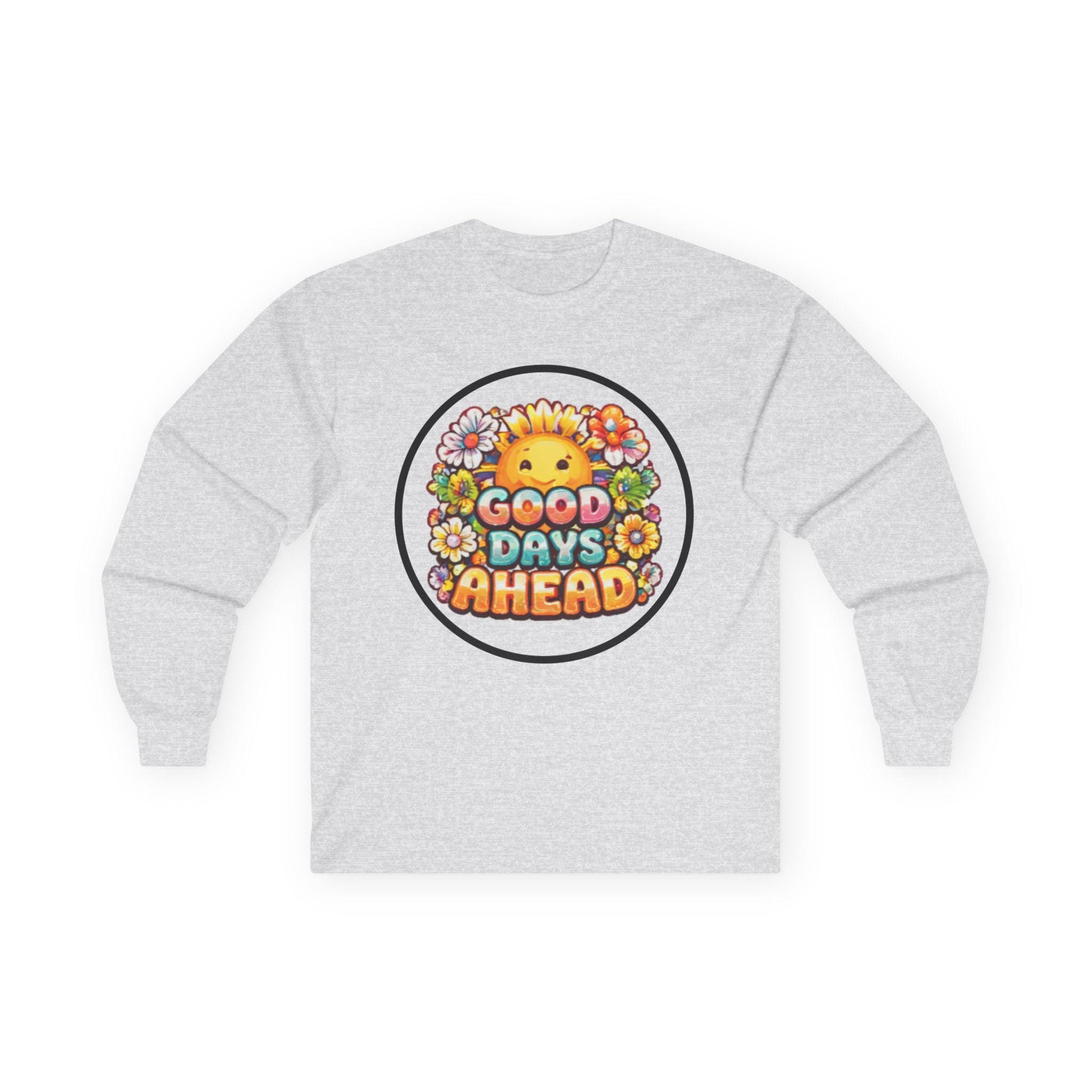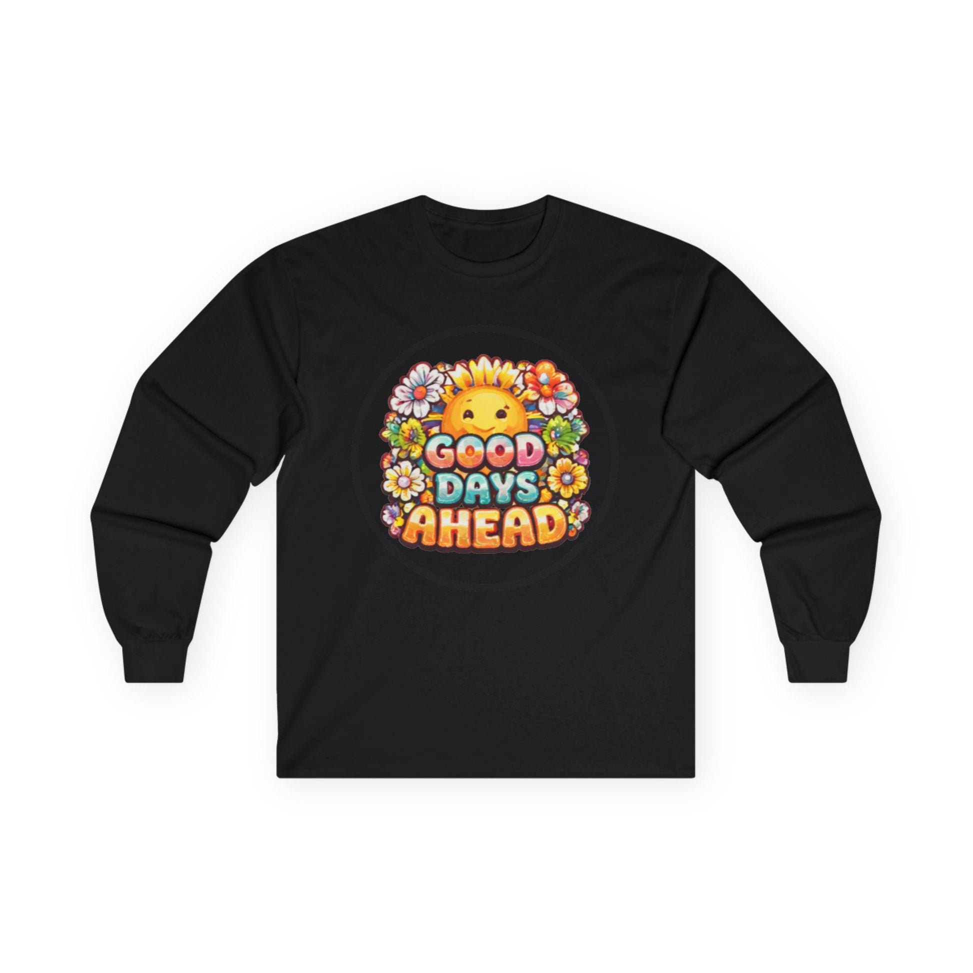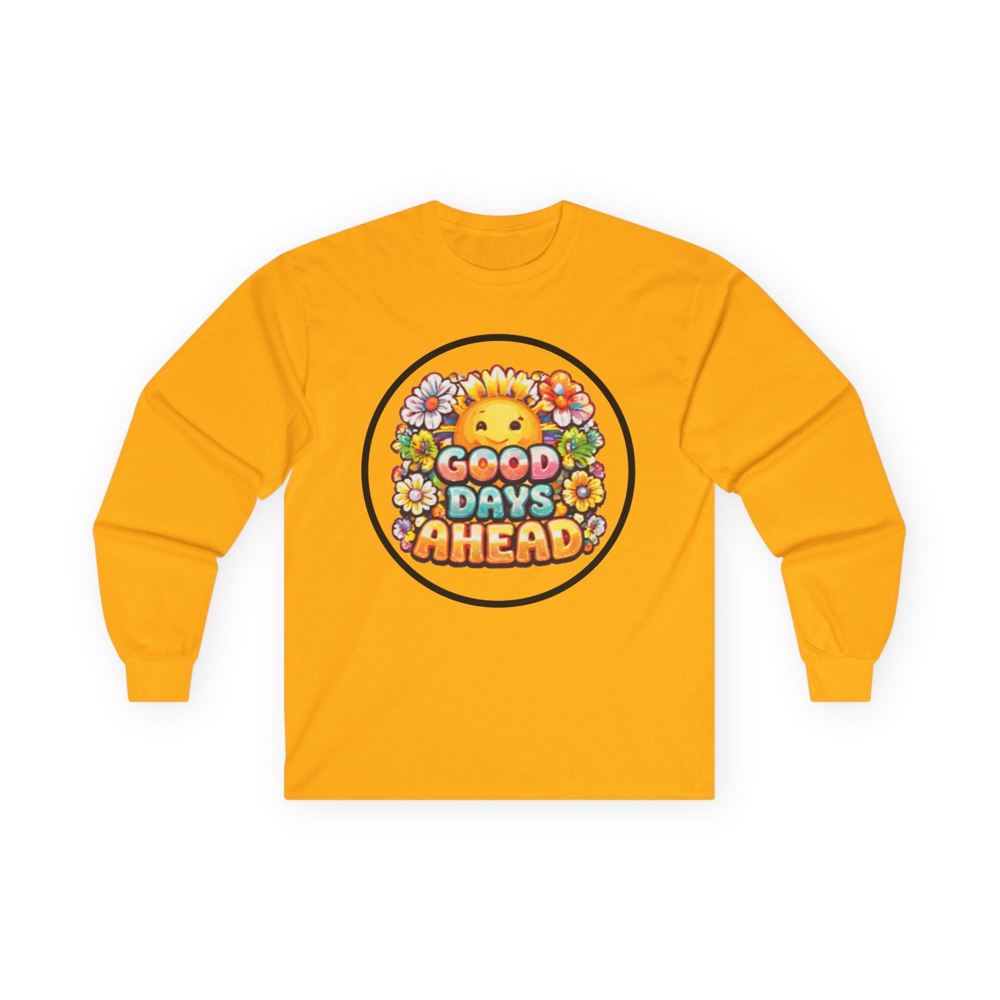 Lightweight vintage comfort with a sunny attitude. This long-sleeve tee wraps you in a thicker, vintage-feel cotton that still breathes and moves with you. A cheerful, retro-style sun and floral badge — with the optimistic message “Good Days Ahead” — sits at the chest, adding a playful, hand-drawn warmth to simple outfits. Wear it on slow mornings with jeans, layered under a jacket for cool evenings, or at small gatherings when you want to share a quiet boost of positivity. The classic fit and ribbed collar keep the silhouette familiar; the tubular knit and shoulder tape mean fewer seams and a cleaner drape. For people who collect feel-good art and soft, lived-in staples, this tee becomes one of the go-to pieces that quietly lifts the day.