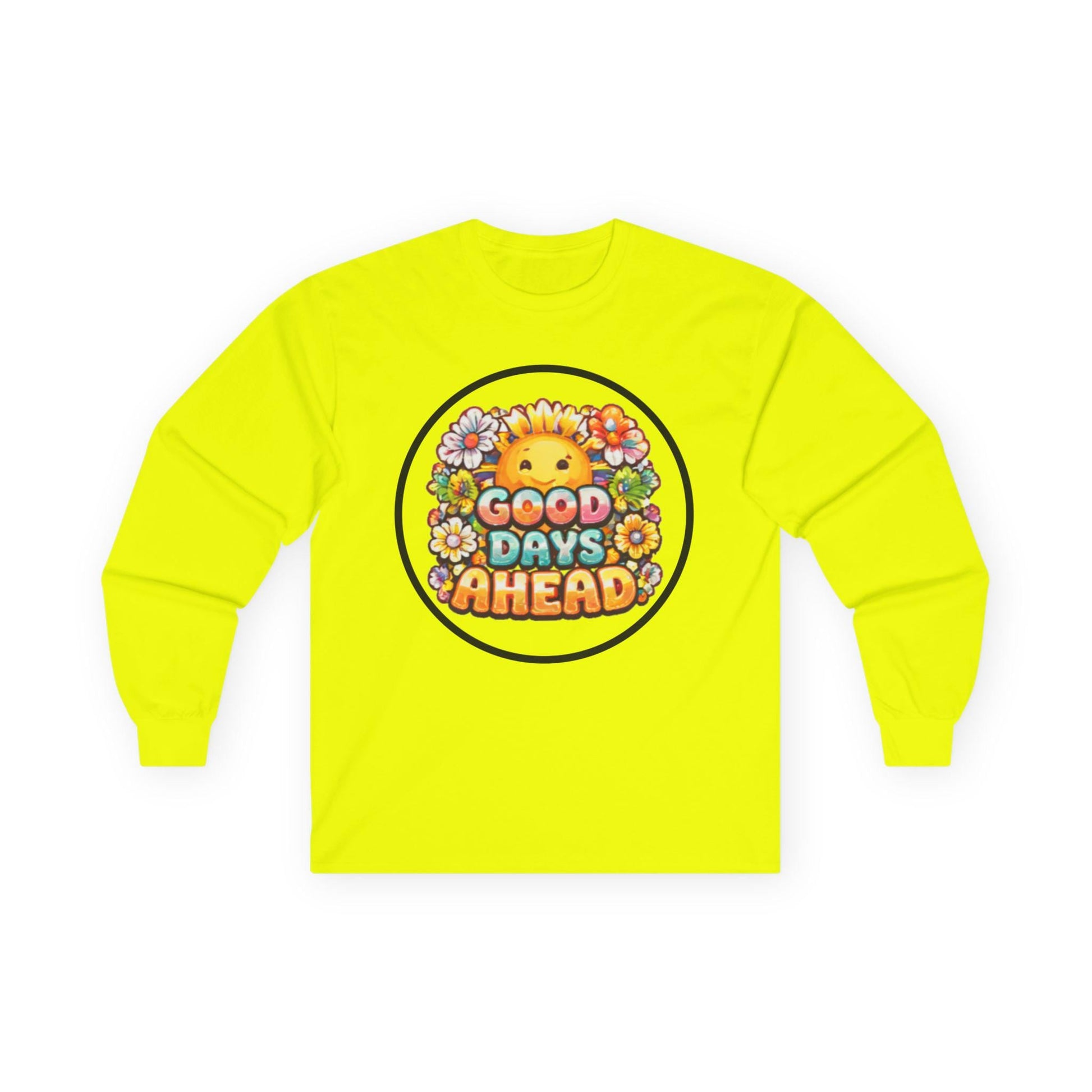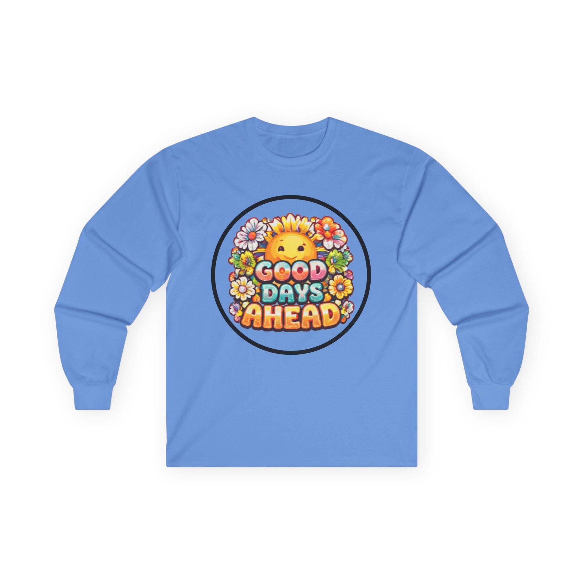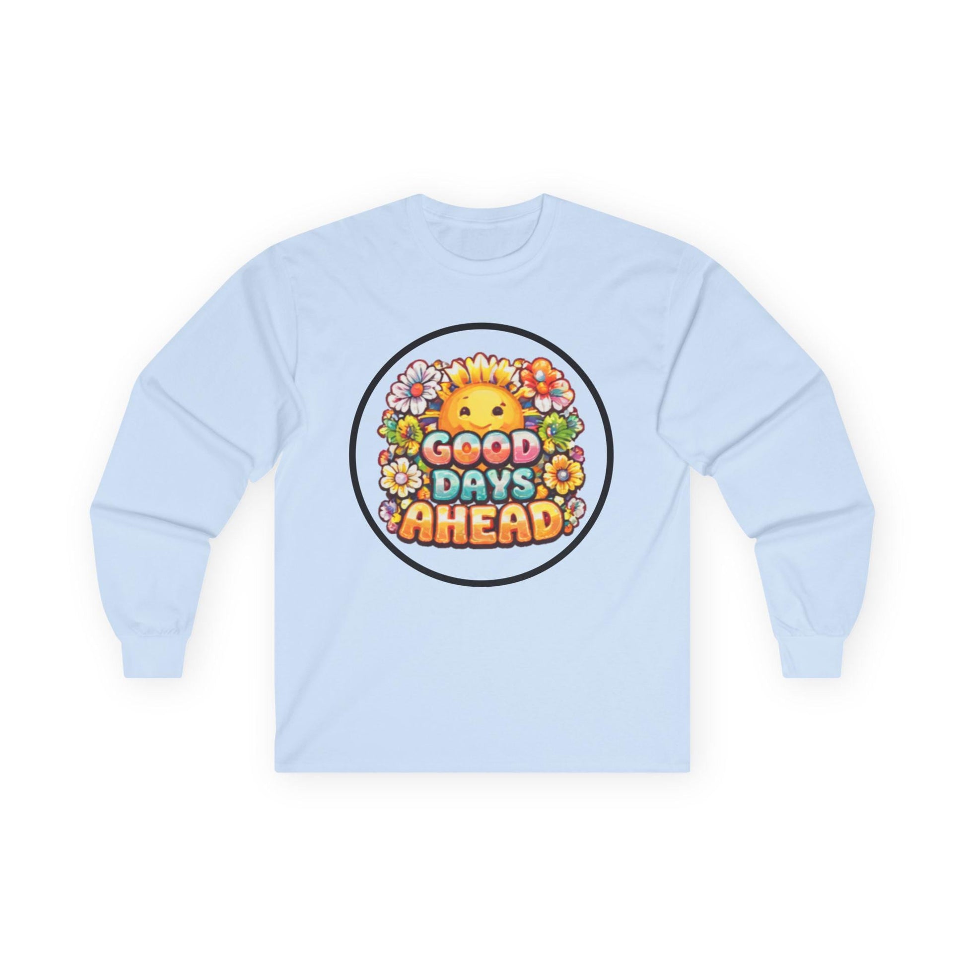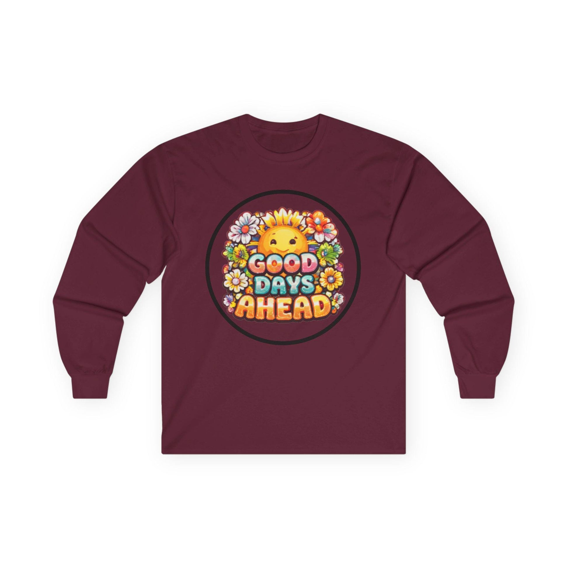 Lightweight vintage comfort with a sunny attitude. This long-sleeve tee wraps you in a thicker, vintage-feel cotton that still breathes and moves with you. A cheerful, retro-style sun and floral badge — with the optimistic message “Good Days Ahead” — sits at the chest, adding a playful, hand-drawn warmth to simple outfits. Wear it on slow mornings with jeans, layered under a jacket for cool evenings, or at small gatherings when you want to share a quiet boost of positivity. The classic fit and ribbed collar keep the silhouette familiar; the tubular knit and shoulder tape mean fewer seams and a cleaner drape. For people who collect feel-good art and soft, lived-in staples, this tee becomes one of the go-to pieces that quietly lifts the day.
