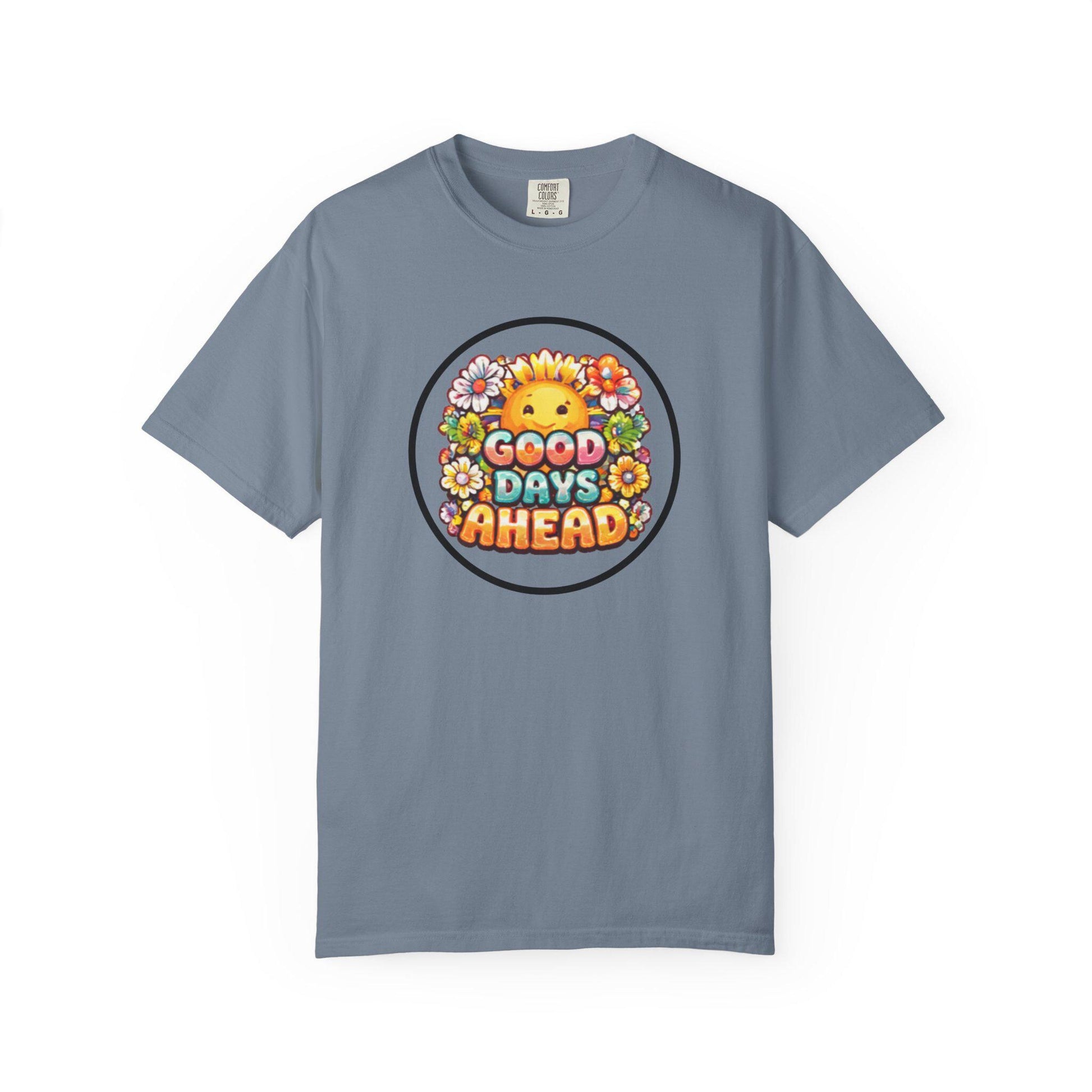 This relaxed, garment-dyed tee brings a warm, nostalgic smile to the everyday. Soft, heavyweight cotton and a lived-in color give it the feeling of a favorite shirt straight out of the drawer. A cheerful circular graphic — a sunny character peeking through a ring of blossoms with the message “Good Days Ahead” — sits on the chest, making the shirt a quiet, optimistic statement you can wear alone or layer under jackets. It moves with you, holds its shape, and keeps that washed-in softness wash after wash. Wear it on slow mornings, casual meetups, or when you want to send a little brightness into someone’s day.