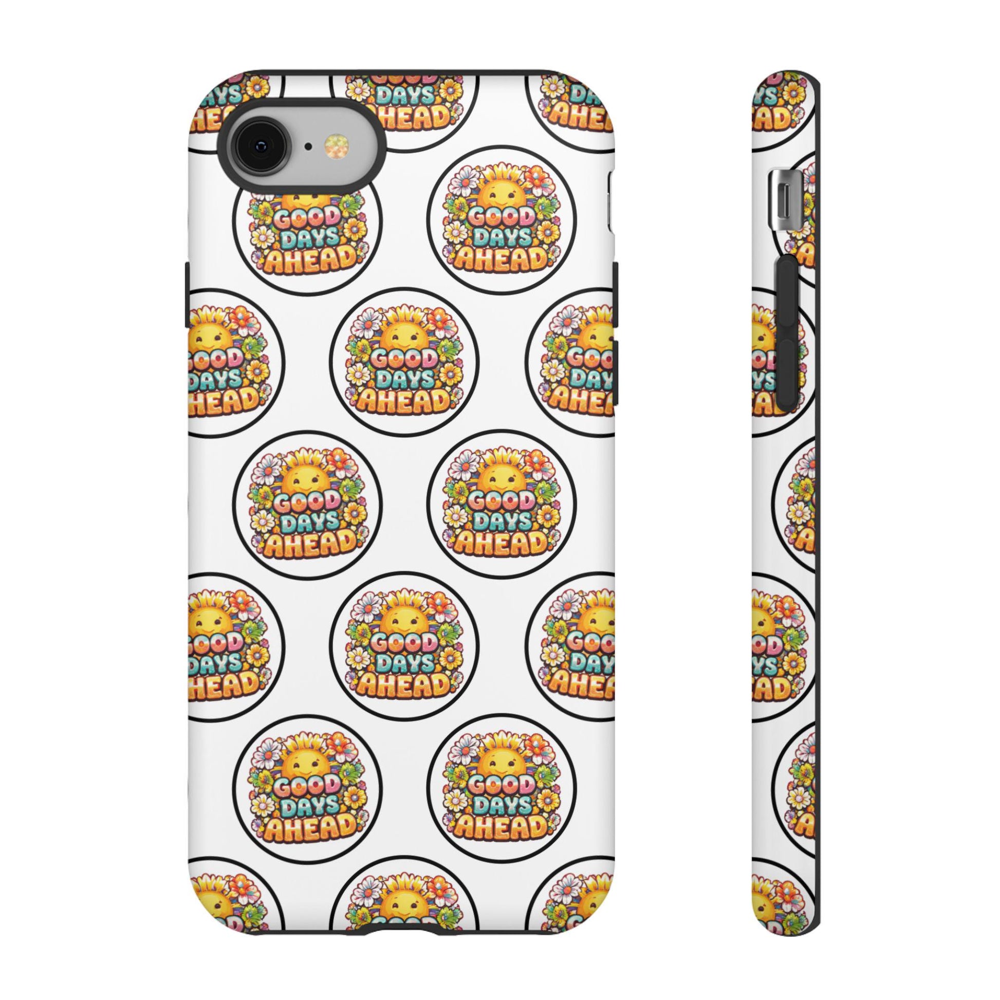 This tough phone case blends cheerful retro art with serious protection. A repeating circular motif — a smiling sun, tiny flowers and the optimistic words “Good Days Ahead” — wraps the case in bright, feel-good energy. It’s a dual-layer shell with a rigid polycarbonate exterior and a soft TPU silicone liner that soaks up shocks and resists everyday knocks. The design is printed in full-wrap, high-density 3D ink with UV protection so the colors stay vivid outdoors. Slim edges keep ports accessible and the case supports wireless charging while giving a visibly glossy or subtle matte finish depending on your choice. It fits into everyday routines for people who want their devices to feel personal and upbeat without sacrificing drop protection.