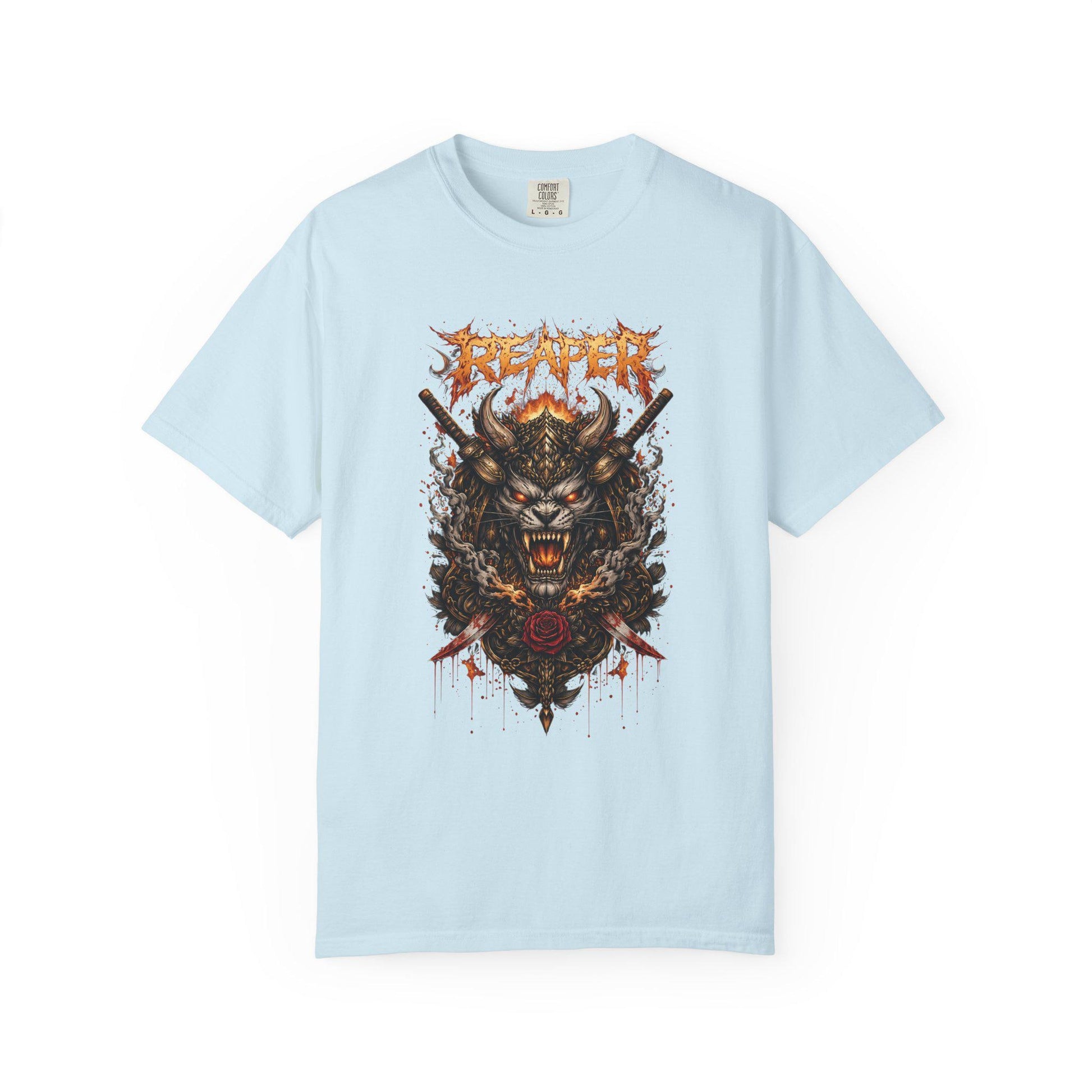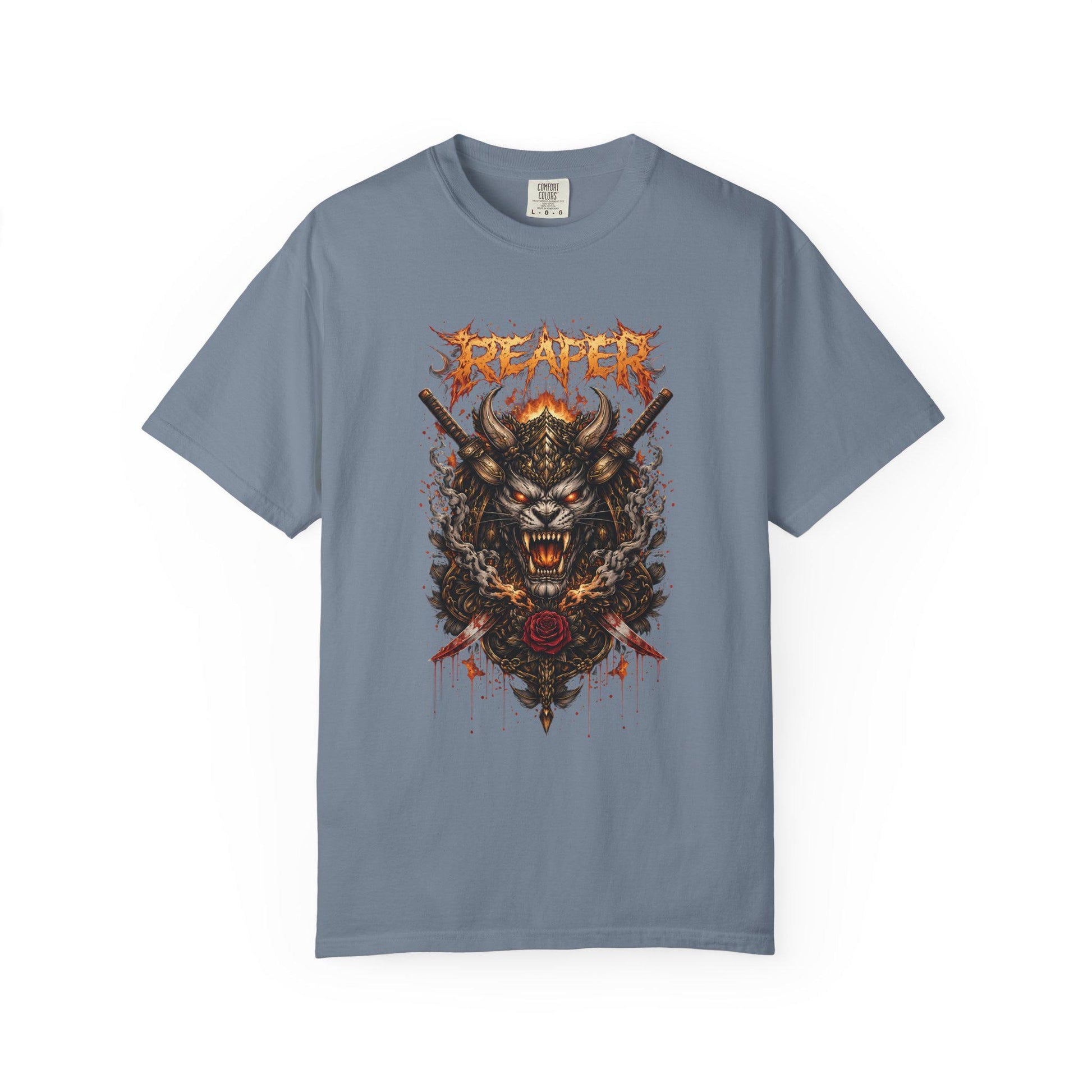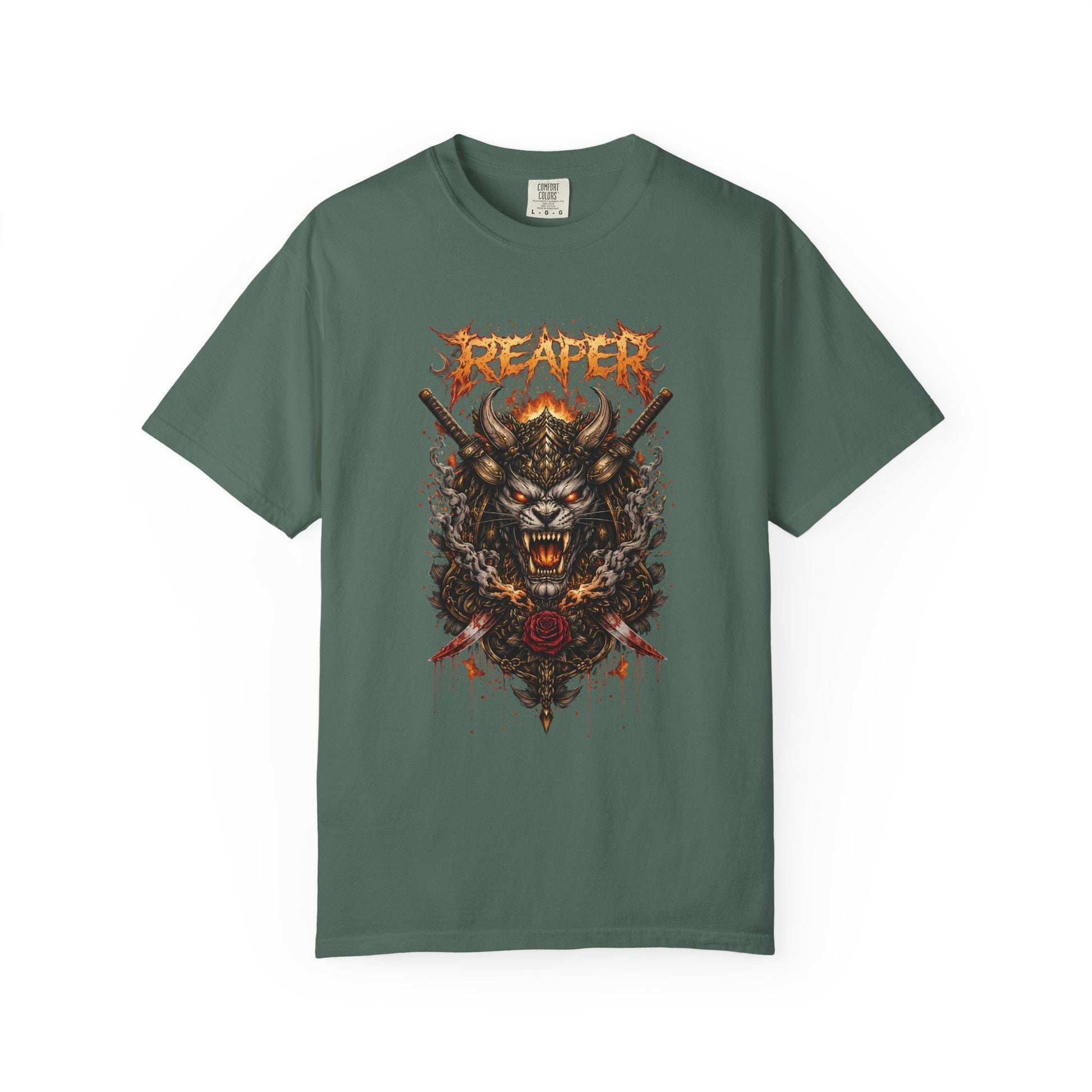 This heavyweight garment-dyed tee carries a raw, underground energy. The front features a fierce, hand-drawn reaper/wolf hybrid crest with distressed lettering and splashes of blood-red and rust tones. It wears like a lived-in favorite: the dyeing after construction gives the fabric a soft, broken-in feel and muted color that deepens the graphic’s vintage vibe. The relaxed cut and heavyweight cotton make it comfortable for long days and late-night shows. Wear it under a leather jacket or alone at the merch table — it anchors looks that lean into darker, gritty aesthetics and band-driven style.