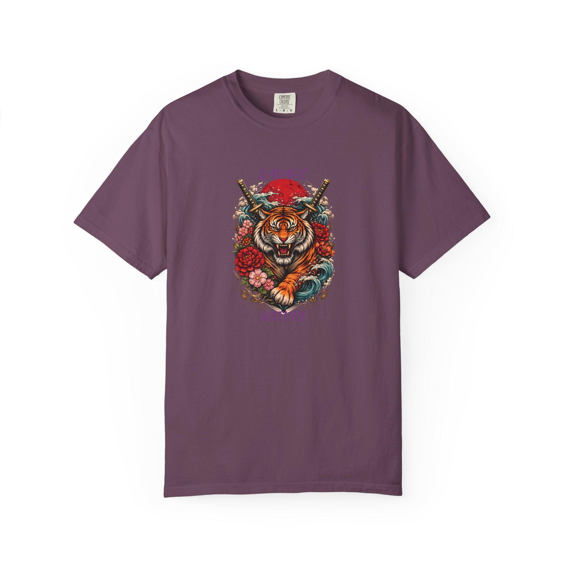 This heavyweight, garment-dyed tee carries a bold, vintage-tattoo energy — a prowling tiger framed by roses and crossed arrows under a blood-red sun. The soft-dyed finish and relaxed cut make it feel lived-in from day one, while the dense 100% ring-spun cotton holds the rich print with lasting clarity. Wear it while wandering forest trails, at weekly jams, or layered under a flannel for nights around the fire. It sits casually at the shoulders and drapes naturally, so the artwork stays front-and-center without feeling stiff. The sewn-in label and double-needle seams give it a handcrafted, durable quality that matches the design’s fierce spirit.