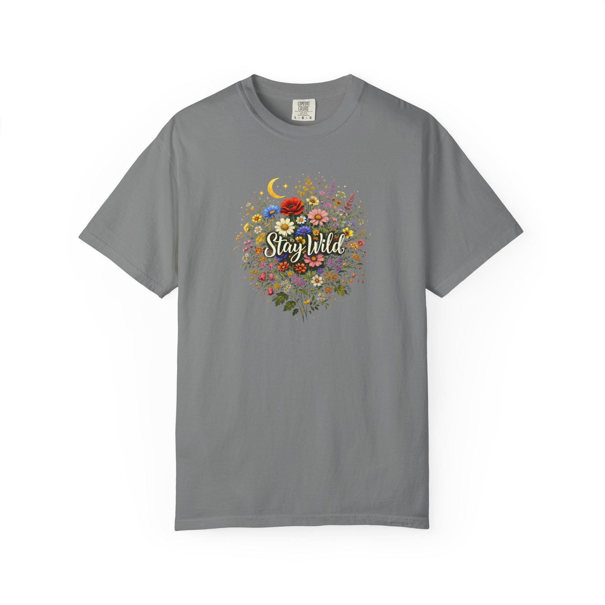 A soft, garment-dyed tee with a vintage floral crest and the gentle phrase “Stay Wild” at its center. The heavyweight cotton feels substantial but broken-in, and the relaxed cut drapes easily over layers or pairs with worn-in denim. The hand-dyed finish gives each piece a lived-in color and texture, so the artwork—an array of wildflowers, a crescent moon, and delicate foliage—looks like it belongs to you from the first wear. Wear it on slow mornings with coffee, on trail-side picnics, or at backyard gatherings where quiet comfort matters more than fashion statements.
