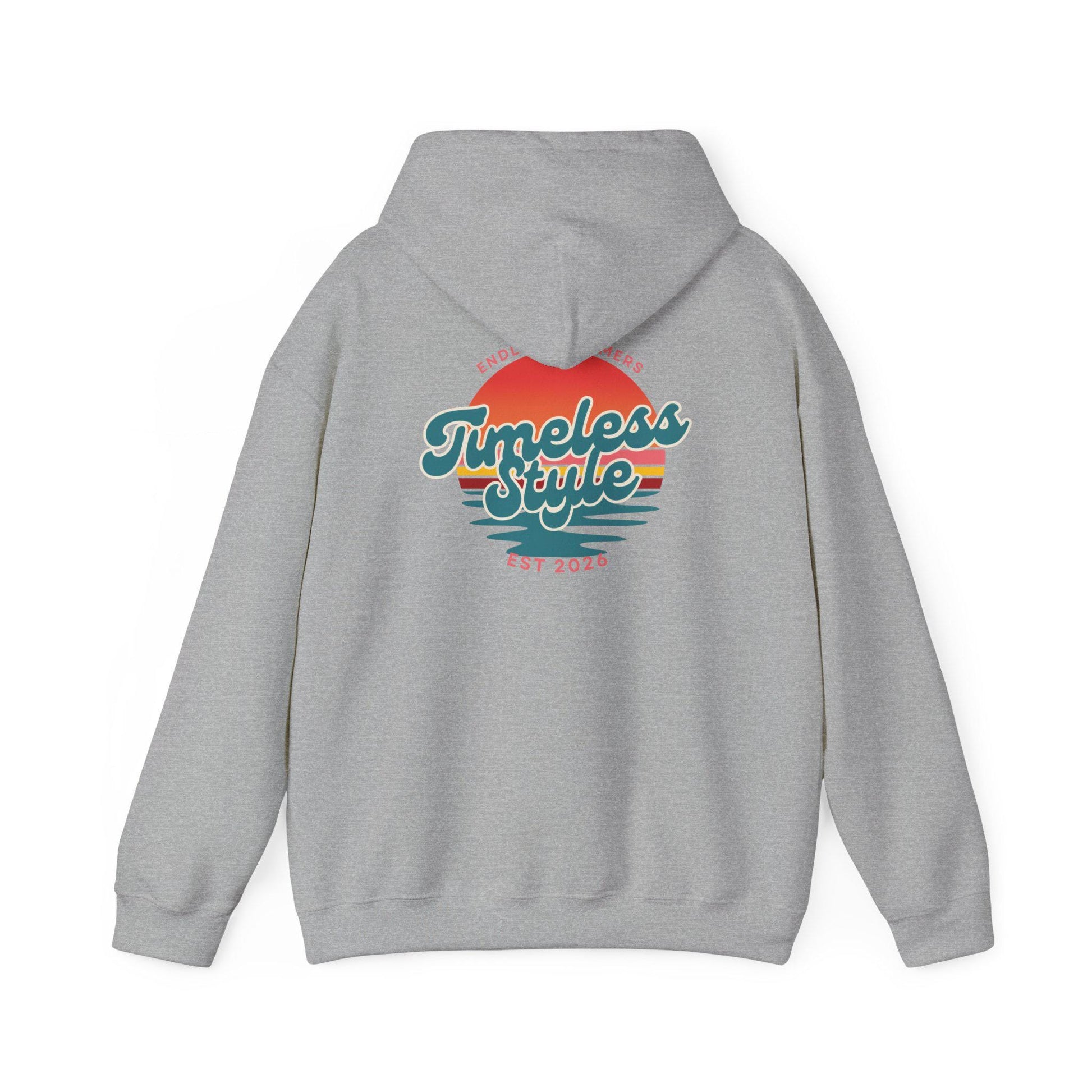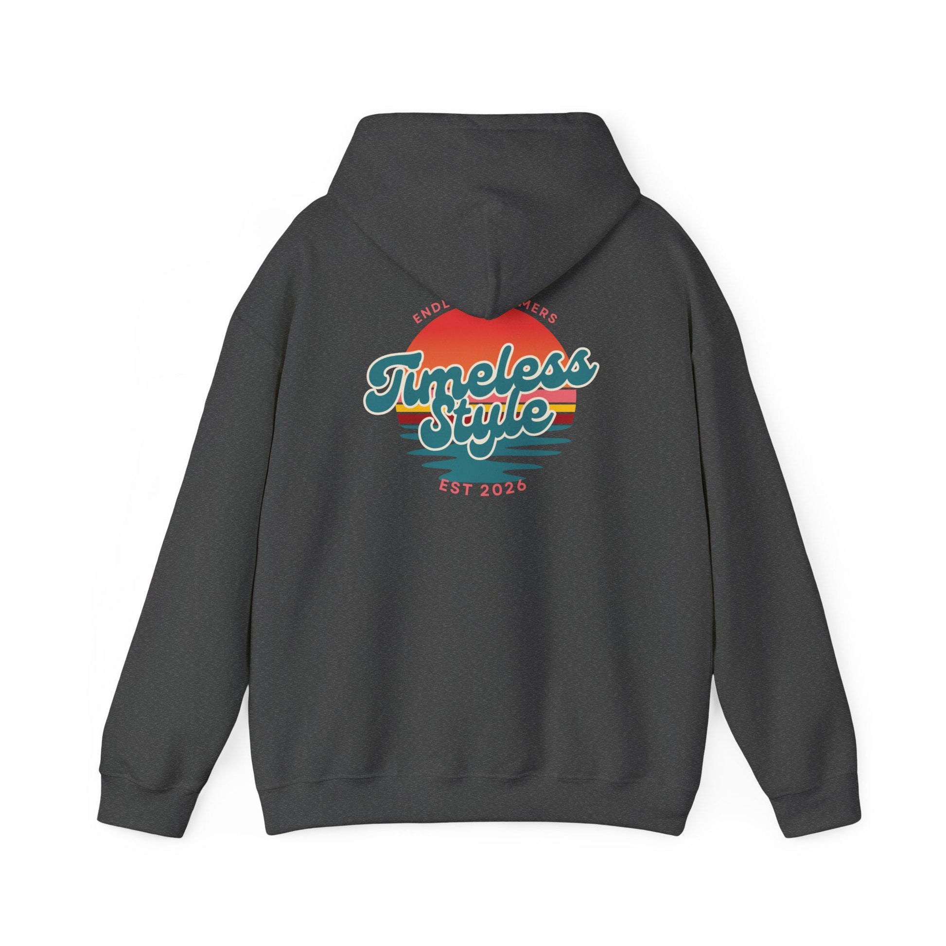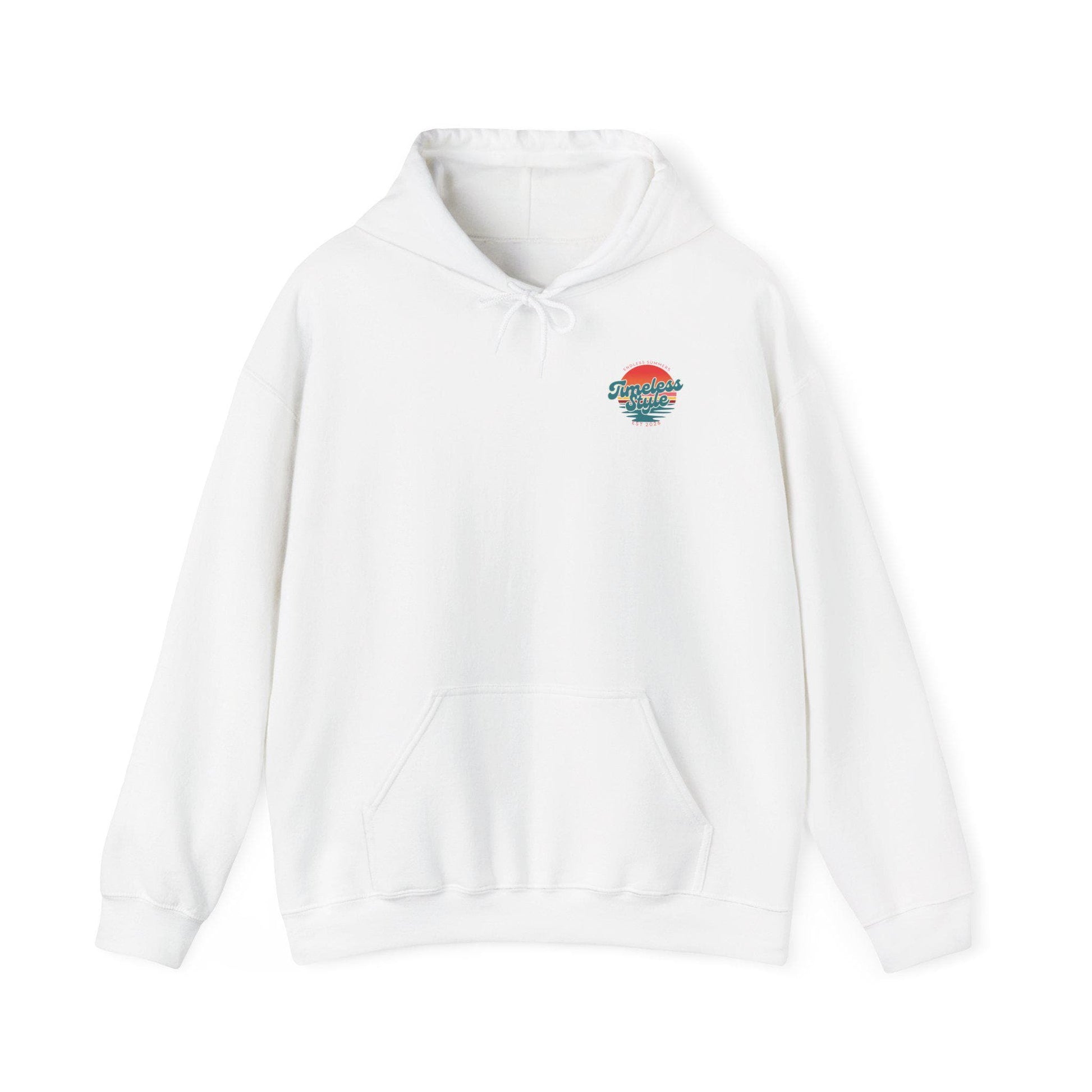 Feel the quiet pull of the shoreline at golden hour. This cozy hoodie carries a small, sun-kissed crest on the chest and a larger retro sunset scene across the back — soft teal waves, warm coral sun, and layered stripes that nod to vintage surf posters. It’s made to be worn on slow drives with the windows down, evenings around a bonfire, or when you simply want a familiar, laid-back vibe. The roomy pouch pocket and double-lined hood make it easy to layer over a tee or flannel, while the understated front emblem keeps the look wearable every day. It settles in like an old favorite and keeps the mood mellow and easy.