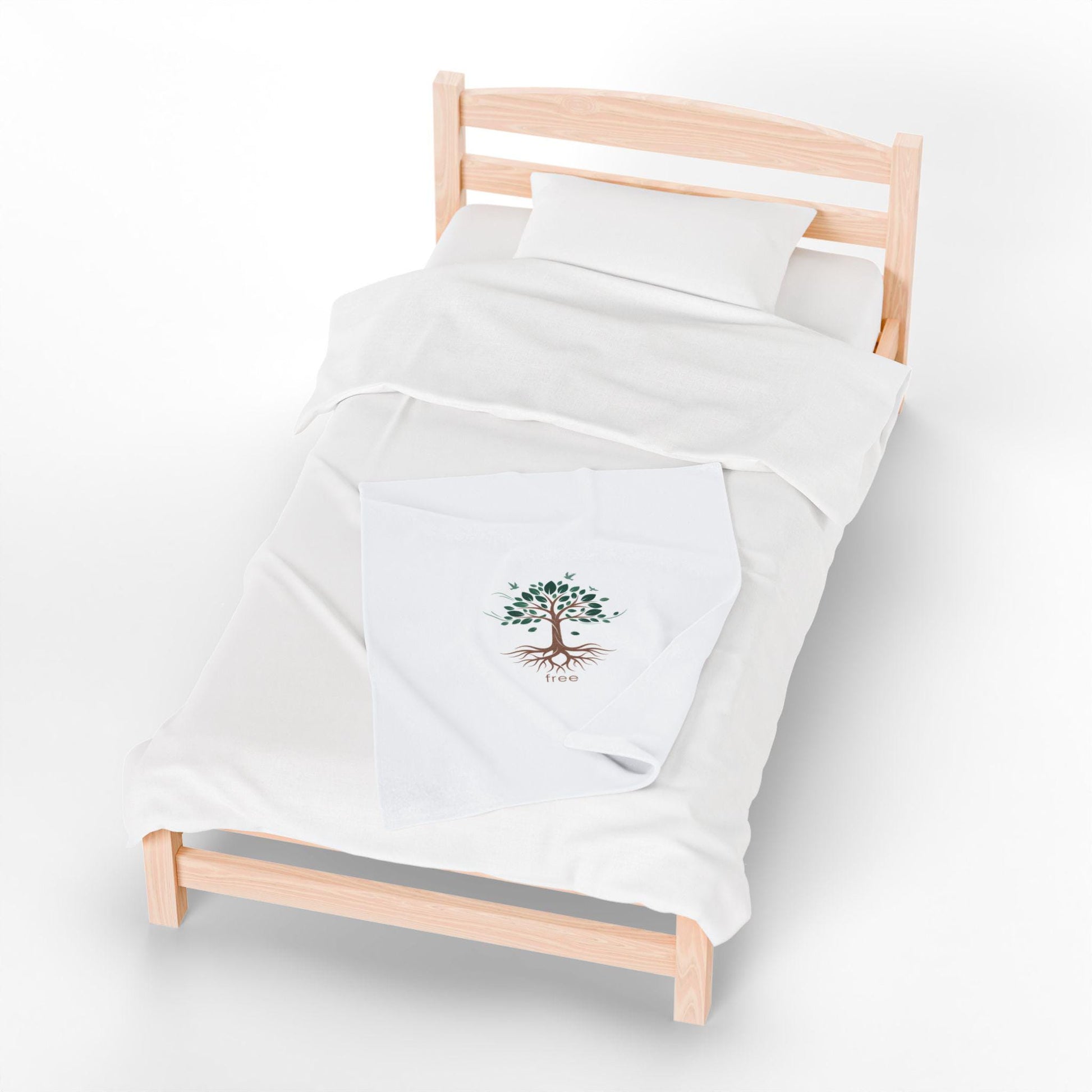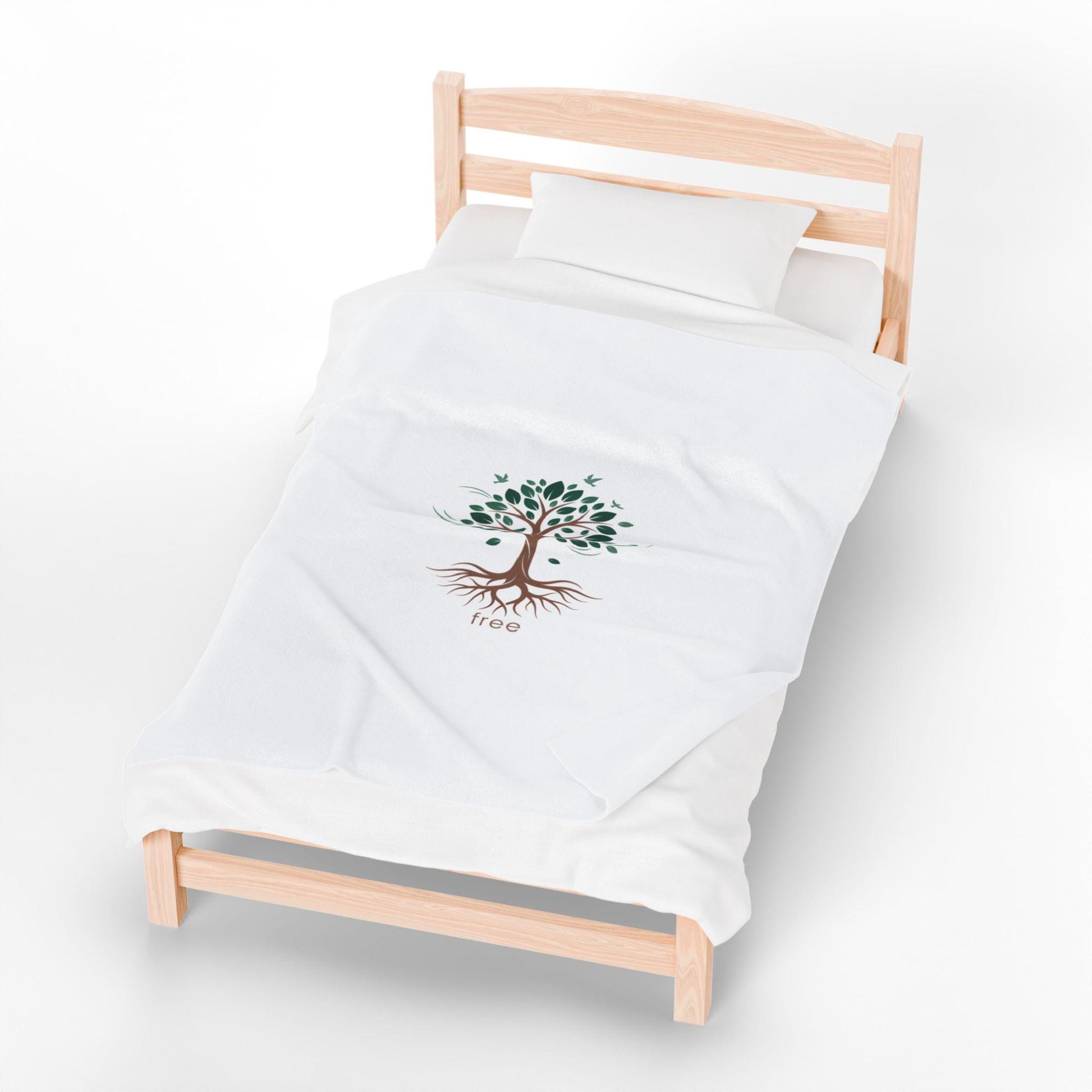 A minimalist nature blanket featuring a simple tree with visible roots in earthy greens and warm brown lines, paired with a small lowercase wordmark beneath. The design leans into Nature Symbols for Coping with calm, grounding motifs and a meditative, quiet aesthetic. Lightweight but medium-heavy polyester knit offers a soft, smooth surface so the single-sided print reads clearly while remaining subtle and restorative in bedroom or lounge spaces.